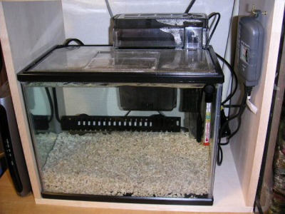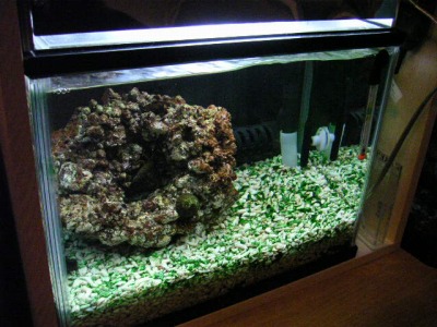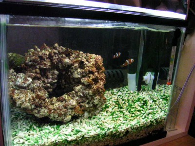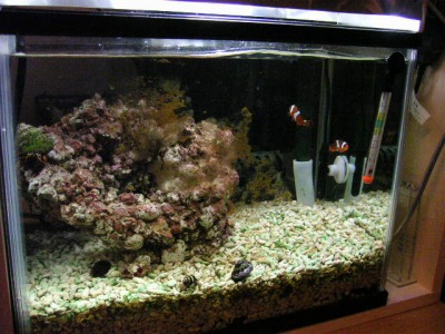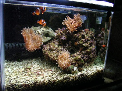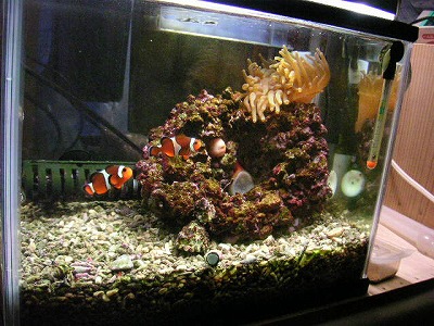 底砂を厚さ5cm程度に敷き、人工海水を満たして、一応のセッティングの完成。
