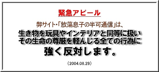 - 店頭において各種の生物商品の販売現場に接触した場合には、その販売環境が商品生物にとって健康を維持するに十分な環境であるかどうかに注目し、もしその販売環境が不当と判断された場合には、例えば眉をひそめるなど、極めて些細な表現であったとしても、何らかの不快の意思表明を行うよう、努力をお願いします。