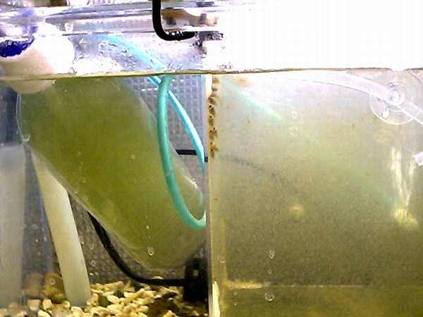 飼育ケースからは左右2ヶ所のプラストーン+エアホースを通じて、保温水槽にオーバーフローする仕組みになっている。