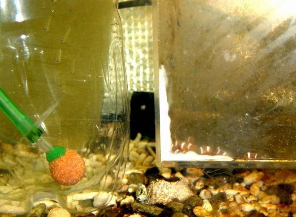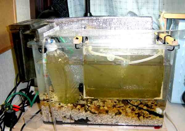 保温水槽にはヒーターと底面濾過+外掛けフィルターがセットされ、水温と水質を一定に保つ。