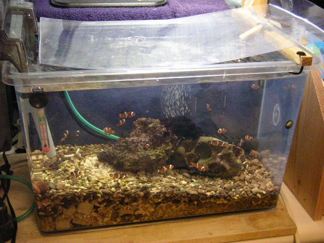 66 | 本日、飼育ケースを外して、通常飼育に移行。 もう人工餌を十分食べられるようになったようなので、飼育ケースを外し、外の保温水槽に直接、入れてしまうことにした。ブラインもやめ。作業は簡単。水温は合っているので、飼育ケースを固定している針金を外し、ケースをひっくり返すだけである。ちびクマたちも最初は戸惑って、一つに固まっていたが、すぐに慣れて、ひろくなった水槽の中を泳ぎまわるようになった。メイン水槽からライブロックを2個、運び込み、イソギンもそのLRの周りに集まる。早速イソギンの中にはいるものもいて、中々良い感じ。特に体の小さいものが、イソギンをお気に入りのようである。 |