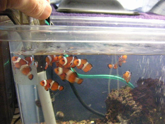 68 | 昨日、今日と、水を換えずに、どの程度まで水が汚れるのか、様子を見た。夜、寝る前にテトラの試験紙で測定すると、亜硝酸はなし、硝酸塩は10mg/L〜25mg/Lの間くらいだった。水量が16〜18Lしかないし、食べ残しの餌も多いので、もっとすぐに水質悪化するかと思ったが、そうでもないようだ。これまでは結局、毎日、3〜6Lの水換えをしていたようなものだが、これからはもっとさぼろう。イソギンもいるので、50mg/Lとかのレベルでは困るが、25mg/Lレベルまでは我慢してもらおうかと思う。そうすれば、本当にただのクマノミ飼育で、ちびっこが沢山いて可愛いだけだから、万々歳である。 ところで、ビデオやデジカメで撮った写真で、ちびクマの数を数えてみると、26〜29匹程度、いるようである。相変わらず正確な数は分からないが、思っていたより多い。ということは、最初は30匹以上、いたんだ。どうも数を数えるのが下手で困るな。 |