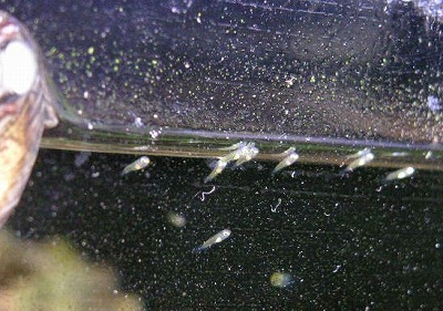 部屋の電気を消したり、黒布を掛けたりした後、30分から40分くらい静かに待って、その後懐中電灯などで水槽の中を覗くと、全長3〜4mm程度の稚魚が、ピコピコと泳いでいるのが観察できると思います。