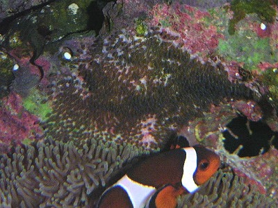 同じころ、オスの方は一生懸命、イソギンチャクの触手に噛み付くような行動をしている場合があります。産卵場所は、そのままではイソギンチャクの触手が届く範囲ですので、その触手に噛み付いて縮めさせて、卵の部分には触手が触れないようにするのではないかと思います。
