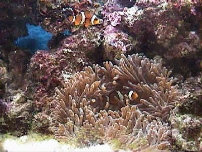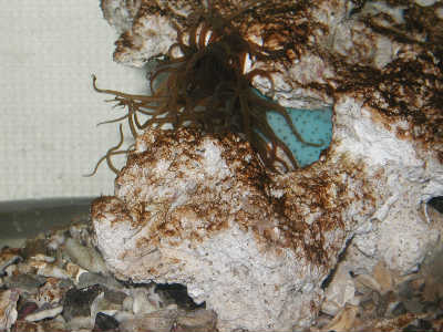 また、確かに石灰藻は好物のようなので、餌が不足するとライブロックをはげ山にしてしまうかもしれません。しかし、うちの場合は塩ワカメ、乾燥カジメ、オキアミなどを適当にあげて”あまりおなかを空かせない”ように気をつけていますのでライブロックは”今のところ”安泰です。また、なぜかうちのウニにとってはライブロックよりも水槽の壁や配管類の表面の方が居心地がよいらしく、ほとんどライブロックには移動しません。