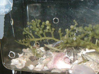 ごく普通のムラサキウニです。これは石灰藻対策に入れたものではなく、採集した海藻にまぎれて小指の先ほどの大きさのときにわが水槽にやってきました。