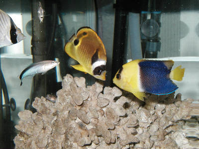 もう1匹はスジモヨウフグ。餌付け水槽でマメサザナミと一緒に餌付けしていた個体です。すっかり乾燥餌に慣れてくれたものの、サザナミのヒレをかじるので、そろそろ事務所に連れて行って大きいチョウたちと混泳させようと思ってました。