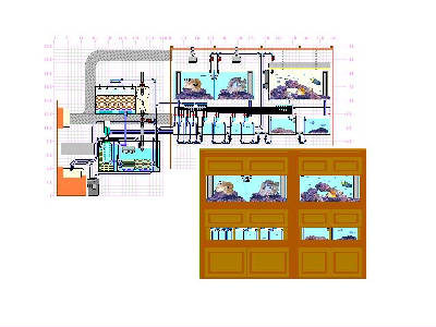この場合、飼育水の集中管理が出来て良いという反面、例えば一度白点病などの病気が発生した場合、全ての水槽に白点虫が蔓延しかねないというリスクも負います。7つの水槽のどれかにLRが入っている場合には、全ての水槽で薬品の使用が出来なくなってしまいますから、特にチョウの飼育を考える場合には(白点病のリスクの高い魚ですから)、少し危険性の高い水槽システムではないかな?という気がします。