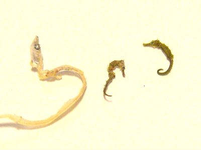 ま、とりあえず、一つまみ取り出してざっと見てみたところ、本来のチリメンジャコ(カタクチイワシの稚魚の素干し)よりは、「チリモン」の方が沢山で、目立ったものはカニ類のゾエアとメガロパ、シャコの幼生(アンチゾエア/アリマ)、アジの子供、タチウオの子供などだったでしょうか。“目玉”としてはタツノオトシゴ(全長2cmくらい)なども混じっておりまして、ひじょーに満足(笑)。