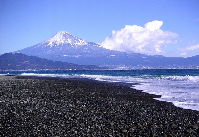 | 駿河湾シリーズ(笑)、第三弾です。 今回はバリバリ、方言の話し言葉で、お爺ちゃんが孫に聞かせる寝物語的な口調で書いてみました。 ここで出てくる静岡方言は、作者の父や父のイトコなどが喋っている言葉を参考にしており、静岡県静岡市(旧清水市)の駿河弁に、やや甲州弁の要素が混じった感じになっていると思います。清水は甲州街道の起点になっていますので、昔から甲州(山梨県)との文化的交流がありました。 お話の中で出てくる「三保の岬」は、「天女の羽衣」の伝説で有名な、「三保の松原」がある半島です。駿河湾の西岸で、そこだけが小さく飛び出して、岬になっているんですね。上空から見た時に、まるで人間の腕や手の平のように見えると言うのは、地元の航空写真を見る度に、子供の頃から、私が感じていた事です。駿河湾の中に手を出して、何かを手繰り寄せようとしているように、見えてなりませんでした。 この三保からの富士山の眺めが「日本一」というのは、誰かの公認という訳ではありませんが、清水出身者としては譲れないところです。空気の澄んだ冬の、天気の良い日などに、三保半島の海岸から富士山を眺めると、頂上から裾野が広がって駿河湾に注ぎこむところまで、一望する事が出来ます。途中、富士山の裾野をさえぎるものが何も無いんですよ。 清水に生まれた私は、そんな富士山を毎日、眺めて育ちました。 今では清水を離れて暮らしていますが、何かの折に富士山が目に入ったとき、周りの人々が「わあ、きれい。」などと行っているのを聞くと、「チッチッチッ!そんなモンで満足してちゃいけないよ。富士山の最も美しい姿を、キミたちは見たことがあるまい。」などと、イヤらしいことを考えてしまいます(笑)。 |